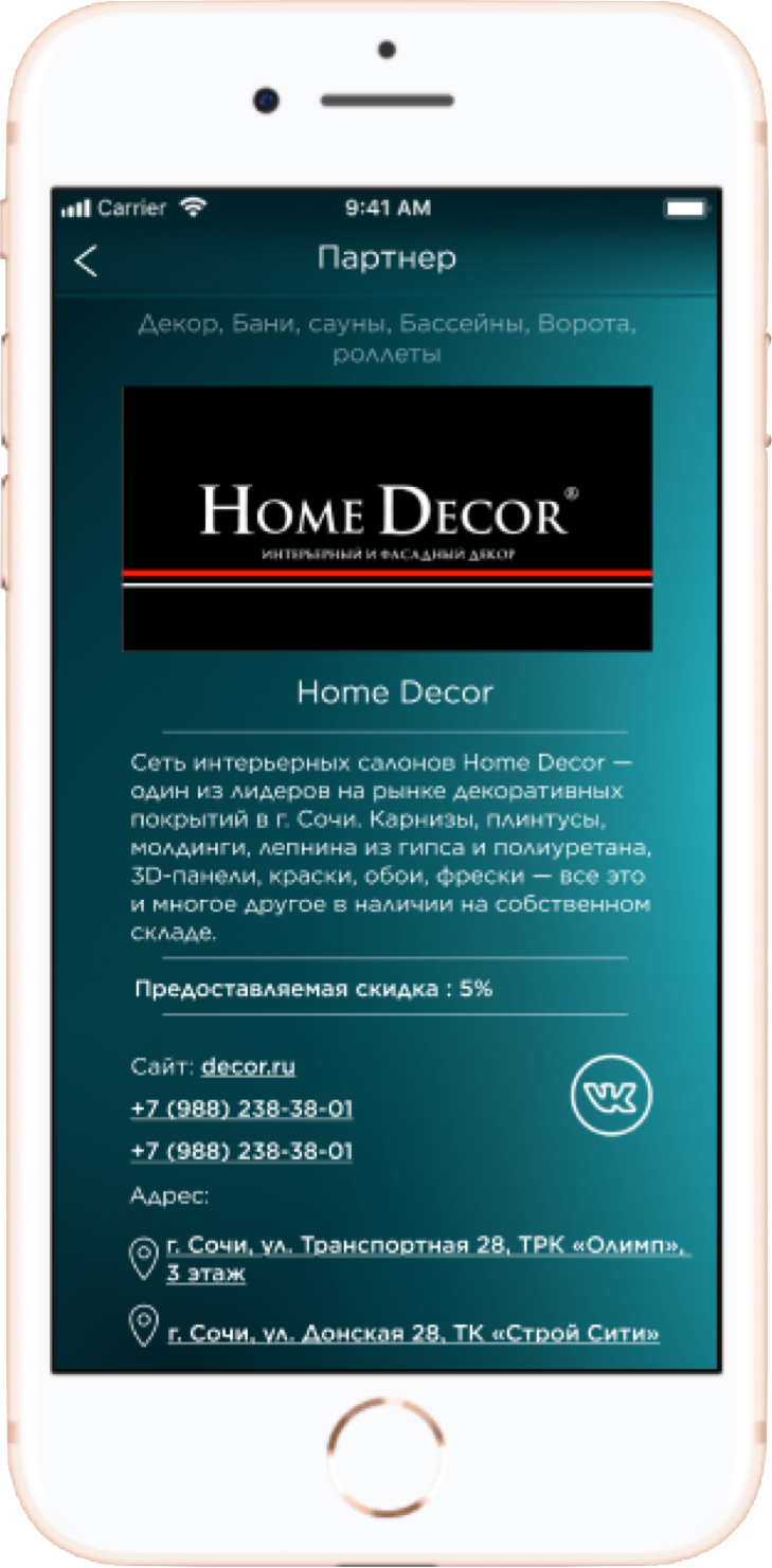 Мы решили создать общую систему скидок, агрегатор строительных магазинов в г. Сочи Поработав офф-лайн, поняли, что нужно идти в ногу со временем и делать приложение. Изучили рынок и обратились в компанию СВОЁ, так как помимо разработки они еще и оказывают услуги по маркетингу и дизайну. Цена, скорость работы и отзывчивость ребят приятно удивили. Приложение получилось стильным, быстрым и у нас уже множество пользователей. Сейчас продолжаем работать с ними и регулярно выпускаем обновления приложения.